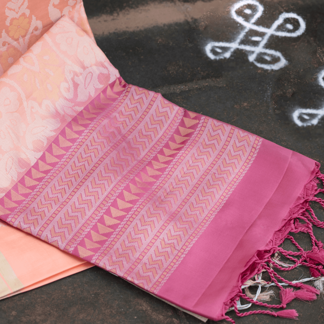 This Tissue Handcrafted Saree is the epitome of sophistication and timeless beauty. Made from delicate tissue fabric, it features a light, ethereal quality that shimmers gracefully with every movement. The saree is handwoven with exquisite craftsmanship, reflecting the skill and artistry of traditional weavers. Its subtle sheen and luxurious feel make it the perfect choice for weddings, festive occasions, or intimate celebrations.